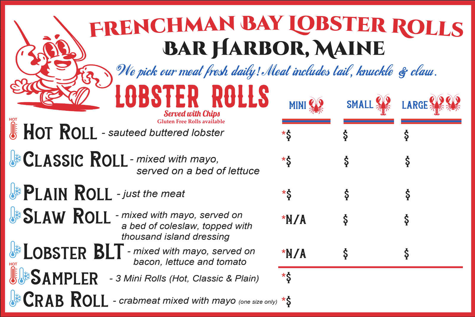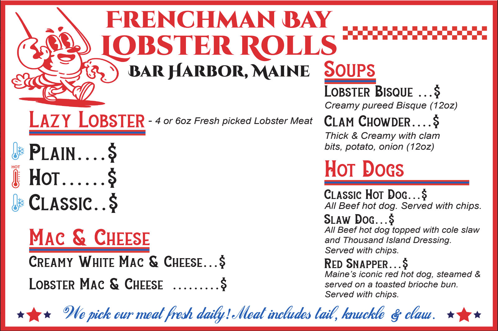 ✳︎ Hot Butter Lobster Roll ✳︎ Maine Classic Lobster Roll ✳︎ Slaw Lobster Roll ✳︎ Plain Lobster Roll ✳︎ BLT lobster Roll ✳︎ Sampler ✳︎ Crab Roll ✳︎ Lazy Lobster - Just the Meat ! ✳︎ Mac & Cheese ✳︎ Lobster Mac & Cheese ✳︎ Lobster Bisque & Clam Chowder ✳︎ Jumbo ALL BEEF Hot Dog ✳︎ Maine Red Snapper ✳︎ Slaw Dog
